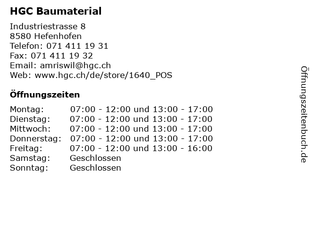 | Öffnungszeiten HGC Baumaterial in Hefenhofen anzeigen | |