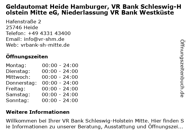 Branchen & Suchbegriffe zu Geldautomat Heide Hamburger, VR Bank Schleswig-Holstein Mitte eG, Niederlassung VR Bank Westküste:bank, eg, geldautomat, hamburger, heide, holstein, mitte, niederlassung, vr, westküste |