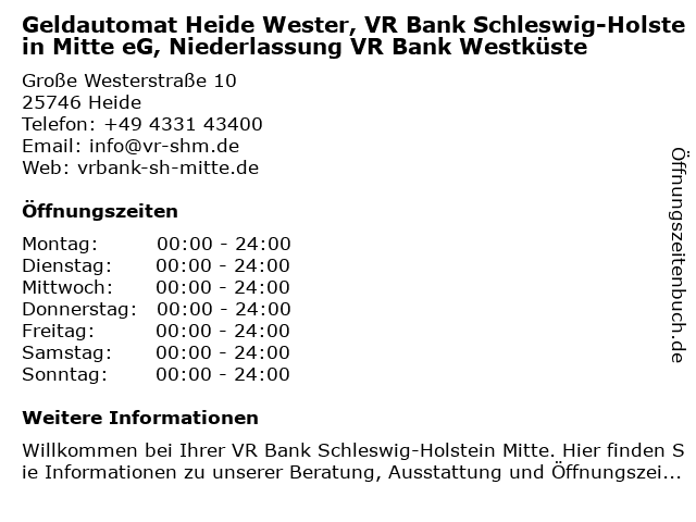 Branchen & Suchbegriffe zu Geldautomat Heide Wester, VR Bank Schleswig-Holstein Mitte eG, Niederlassung VR Bank Westküste:bank, eg, geldautomat, heide, holstein, mitte, niederlassung, vr, wester, westküste |