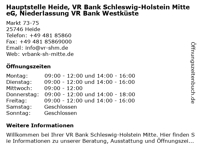 Branchen & Suchbegriffe zu Hauptstelle Heide, VR Bank Schleswig-Holstein Mitte eG, Niederlassung VR Bank Westküste:bank, eg, hauptstelle, heide, holstein, mitte, niederlassung, vr, westküste |