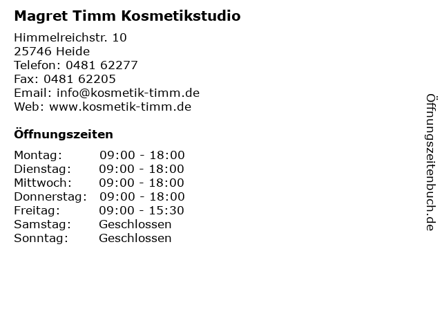 | Öffnungszeiten Magret Timm Kosmetikstudio in Heide anzeigen | |