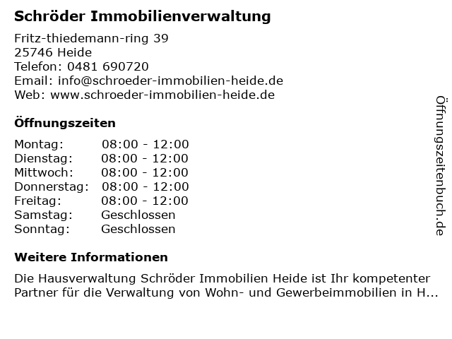 | Öffnungszeiten Schröder Immobilienverwaltung in Heide anzeigen | |