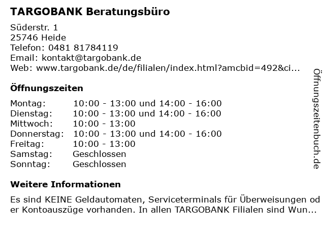 | Öffnungszeiten TARGOBANK Beratungsbüro in Heide anzeigen | |