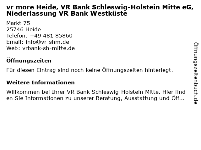 | vr more Heide, VR Bank Schleswig-Holstein Mitte eG, Niederlassung VR Bank Westküste anrufen | |
