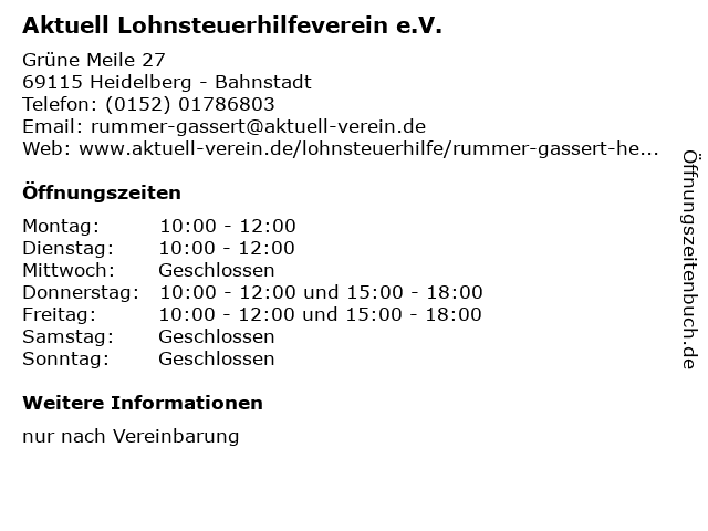 1 Aktuell Lohnsteuerhilfeverein e.V. (Entfernung: 1,24 km) Am Markt 15, 69123 Heidelberg - Pfaffengrund 4 Aktuell Lohnsteuerhilfeverein e.V. (Entfernung: 9,40 km) Obstgartenweg 13, 69181 Leimen - Gauangelloch 6 |