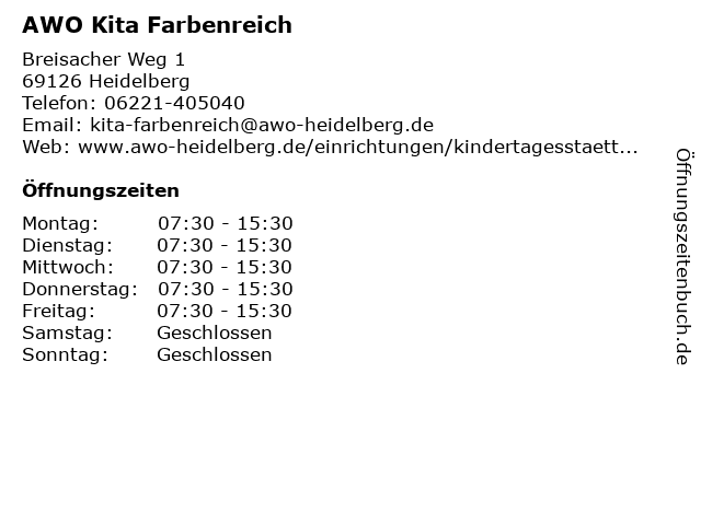 | Öffnungszeiten AWO Kita Farbenreich in Heidelberg anzeigen | |