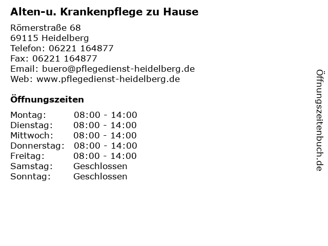 3 myStorage - Lagerräume (Zugang zu den Lagerräumen) (Entfernung: 1,78 km) Eppelheimer Str. 28, 69115 Heidelberg 5 Pohl, Jörg K. St. V. Palatia zu Heidelberg im KV (Entfernung: 2,70 km) Ziegelhäuser Landstr. 43, 69120 Heidelberg 6 Sozialstation St. Vitus Heidelberg-Nord u. Dossenheim e.V. Krankenpflege (Entfernung: 2,91 km) Pfarrgasse 5a, 69121 Heidelberg |