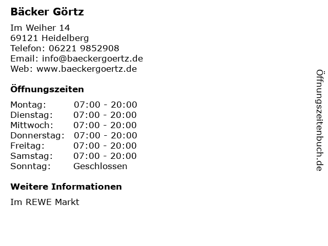 | Öffnungszeiten Bäcker Görtz in Heidelberg anzeigen | |