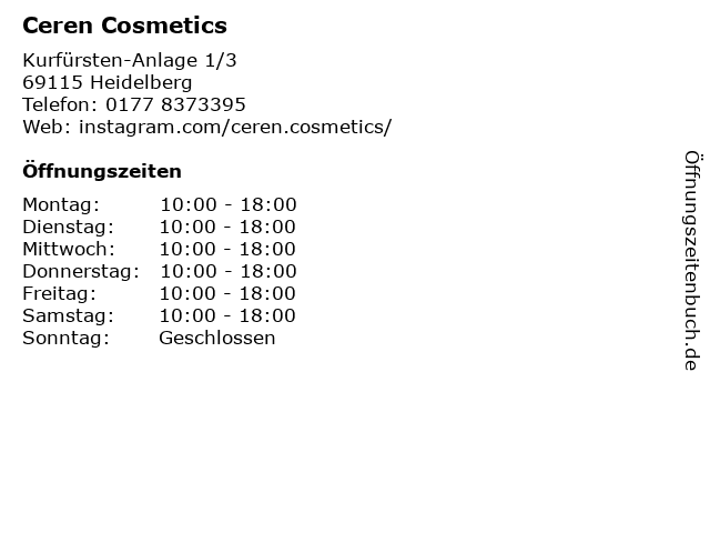| Öffnungszeiten Ceren Cosmetics in Heidelberg anzeigen | |