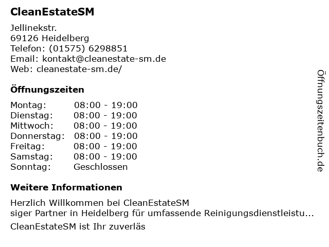 | Öffnungszeiten CleanEstateSM in Heidelberg anzeigen | |