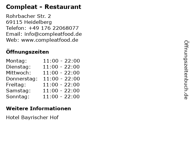 | Öffnungszeiten Compleat - Restaurant in Heidelberg anzeigen | |