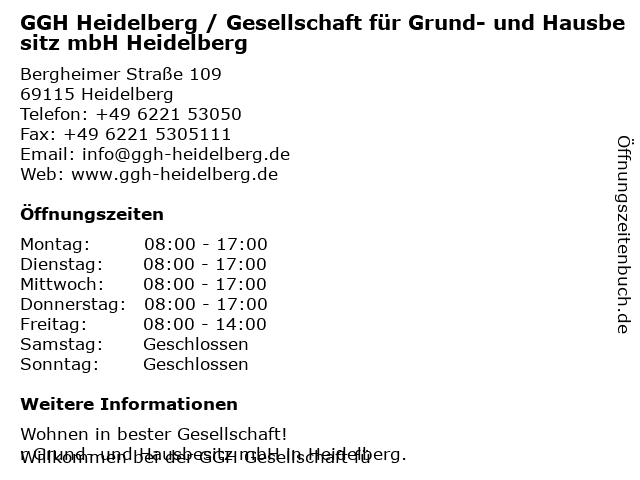 1 GGH Gesellschaft für Grund- und Hausbesitz mbH (Entfernung: 0,08 km) Bluntschlistr. 14, 69115 Heidelberg 2 Gesellschaft für Grund- und Hausbesitz mbH Heidelberg (Entfernung: 1,36 km) Philipp-Reis-Str. 22, 69115 Heidelberg 3 Heiligenbergschule Grund- und Hauptschule (Entfernung: 1,72 km) Berliner Straße 100, 69120 Heidelberg 6 |