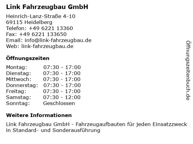 | Öffnungszeiten Link Fahrzeugbau GmbH in Heidelberg anzeigen | |