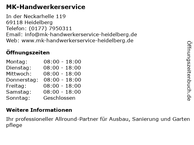 | Öffnungszeiten MK-Handwerkerservice in Heidelberg anzeigen | |