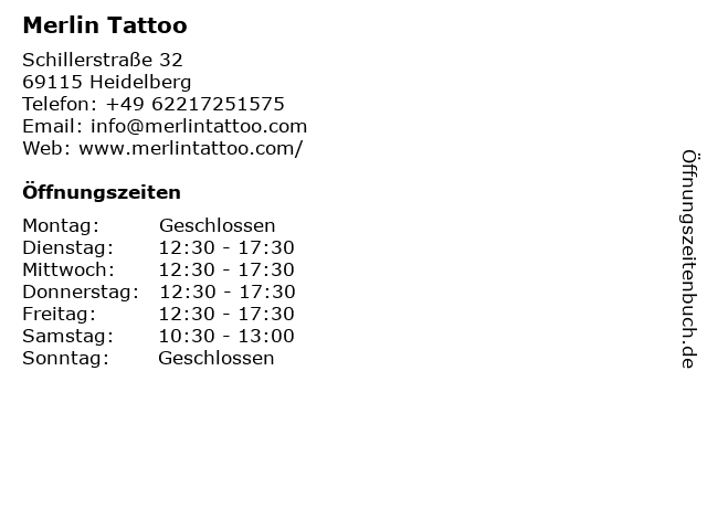 | Öffnungszeiten Merlin Tattoo in Heidelberg anzeigen | |