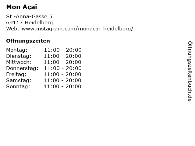 | Öffnungszeiten Mon Açai in Heidelberg anzeigen | |