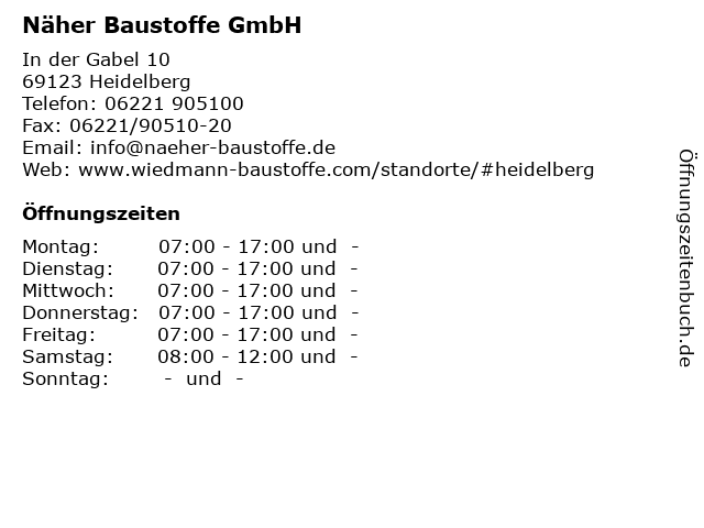 | Öffnungszeiten Näher Baustoffe GmbH in Heidelberg anzeigen | |