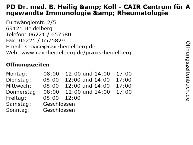 1 PD Dr. med. B. Heilig & Koll - CAIR Centrum für Angewandte Immunologie & Rheumatologie (Entfernung: 14,58 km) Röntgenstraße 3, 69469 Weinheim 2 Priv. Doz. Dr. med. Bernhard Heilig und Kolleginnen (Entfernung: 0,54 km) Wielandtstr. 20, 69120 Heidelberg 3 Facharztzentrum Heidelberg Nord Schwerpunktpraxis Rheumatologie Dr. med. Ino K. Gao, Dr. med. Maria Anna Meier (Entfernung: 1,31 km) Dossenheimer Landstr. 100, 69121 Heidelberg 4 Dr. Dr. med. Werner Zoder u. Koll. - Praxis für Implantologie, Oralchirurgie & MKG-Chirurgie (Entfernung: 1,44 km) Bismarckstr. 9 -15, 69115 Heidelberg 6 |
