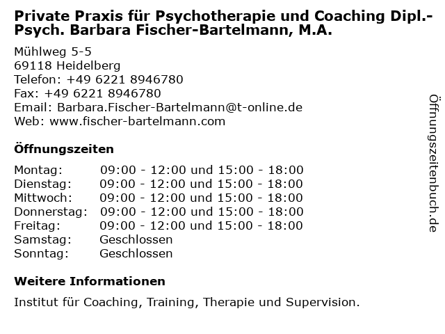 3 Heidelberger Coaching Dipl.-Betriebswirtin Ariane Wahl (Entfernung: 0,82 km) Klingenweg 24, 69118 Heidelberg 4 Key Personal Coaching Inh. Kirsten Eberhardt Fitnessstudio (Entfernung: 0,82 km) Kleingemünder Str. 36, 69118 Heidelberg 6 |
