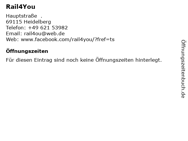 | Öffnungszeiten Rail4You in Heidelberg anzeigen | |