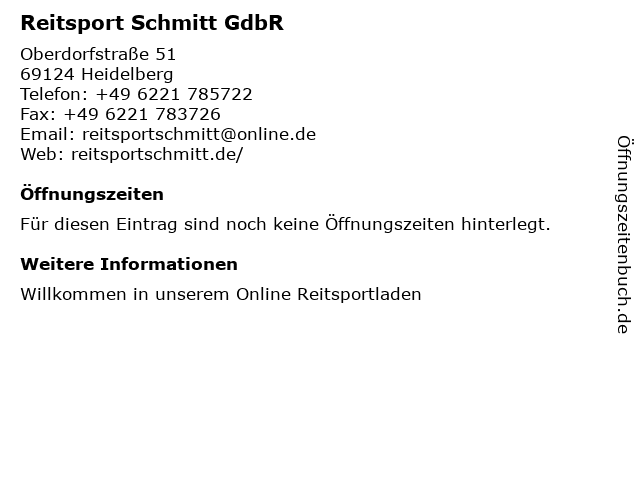 | Öffnungszeiten Reitsport Schmitt GdbR in Heidelberg anzeigen | |