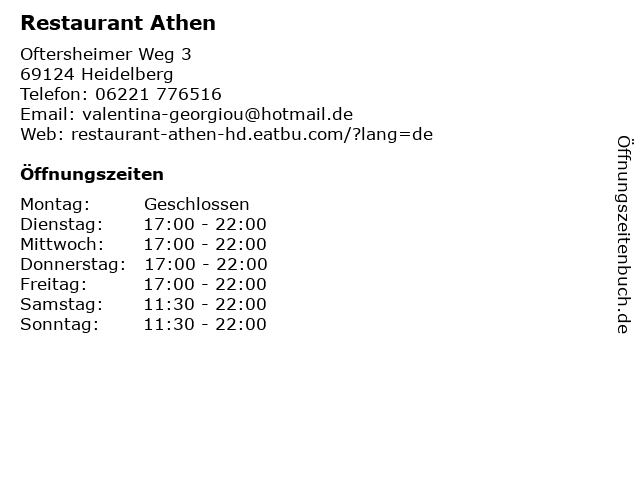 | Öffnungszeiten Restaurant Athen in Heidelberg anzeigen | |