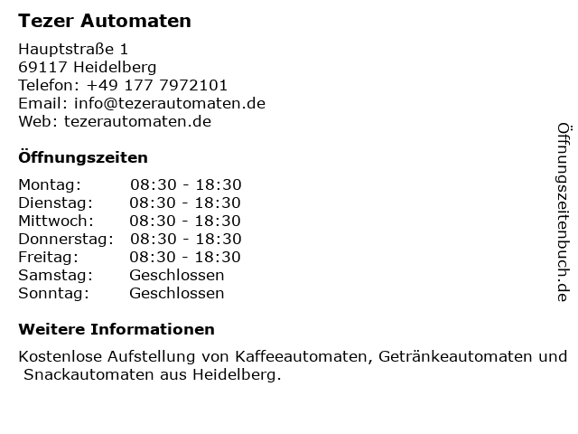 | Öffnungszeiten Tezer Automaten in Heidelberg anzeigen | |