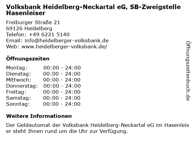 Branchen & Suchbegriffe zu Volksbank Heidelberg-Neckartal eG, SB-Zweigstelle Hasenleiser:eg, geldautomat, hasenleiser, neckartal, sb, volksbank, zweigstelle |