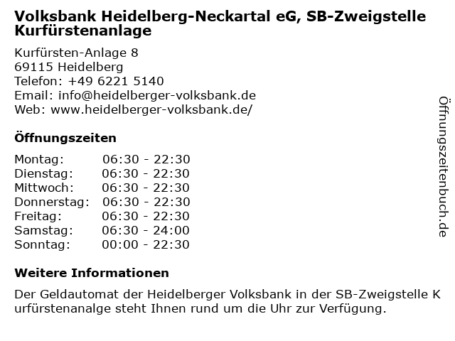 Branchen & Suchbegriffe zu Volksbank Heidelberg-Neckartal eG, SB-Zweigstelle Kurfürstenanlage:eg, kurfürstenanlage, neckartal, sb, volksbank, zweigstelle |