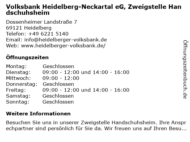1 Heidelberger Volksbank eG (Geldautomat) (Entfernung: 0,00 km) Dossenheimer Landstr. 7, 69121 Heidelberg 3 Heidelberger Judo Club e.V. ( Für Erwachsene ) (Entfernung: 0,22 km) Mühltalstraße 38, 69121 Heidelberg 4 Volksbank Kurpfalz eG - Filiale Handschuhsheim (Entfernung: 0,24 km) Hans-Thoma-Platz 46, 69121 Heidelberg 5 Heidelberger Computerservice Michael Weichhold EDV Dienstleistung und Handel (Entfernung: 1,26 km) Lutherstr. 53, 69120 Heidelberg 6 Volksbank Heidelberg-Neckartal eG, SB-Zweigstelle Kurfürstenanlage (Entfernung: 1,40 km) Kurfürsten-Anlage 8, 69115 Heidelberg |