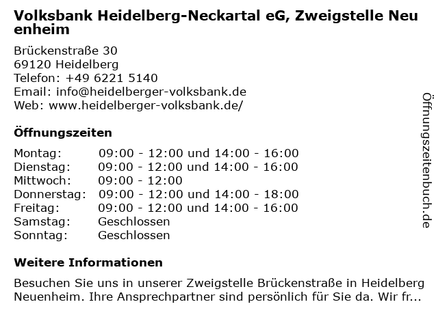 1 Augenpraxisklinik Heidelberg Standort HD-Neuenheim (Entfernung: 0,03 km) Brückenstraße 35, 69120 Heidelberg 6 Volksbank Heidelberg-Neckartal eG, SB-Zweigstelle Kurfürstenanlage (Entfernung: 0,94 km) Kurfürsten-Anlage 8, 69115 Heidelberg |