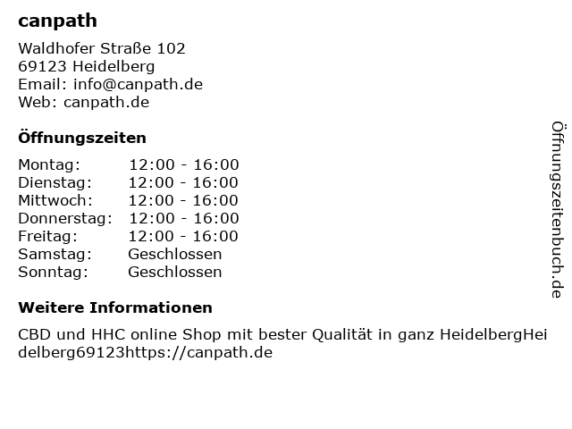 | Öffnungszeiten canpath in Heidelberg anzeigen | |