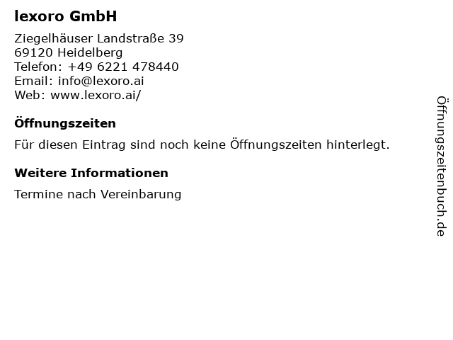 | Öffnungszeiten lexoro GmbH in Heidelberg anzeigen | |