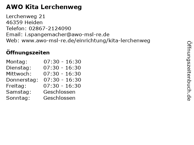 | Öffnungszeiten AWO Kita Lerchenweg in Heiden anzeigen | |