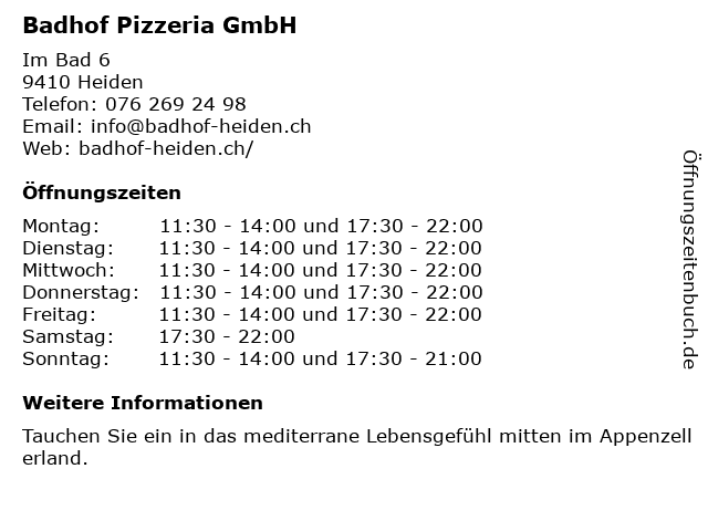 | Öffnungszeiten Badhof Pizzeria GmbH in Heiden anzeigen | |