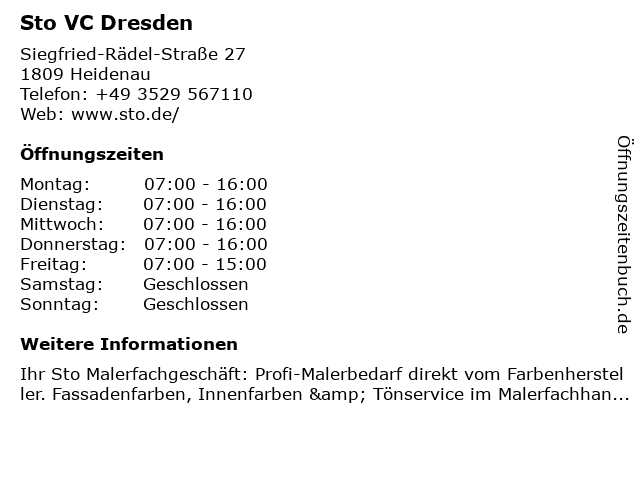 | Öffnungszeiten Sto VC Dresden in Heidenau anzeigen | |