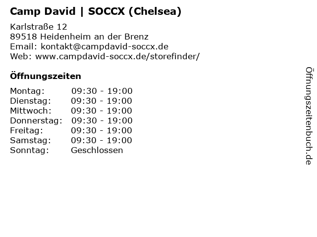 | Öffnungszeiten Camp David | SOCCX (Chelsea) in Heidenheim an der Brenz anzeigen | |