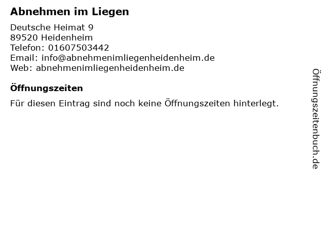 | Öffnungszeiten Abnehmen im Liegen in Heidenheim anzeigen | |