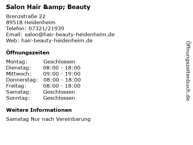 | Öffnungszeiten Salon Hair & Beauty in Heidenheim anzeigen | |
