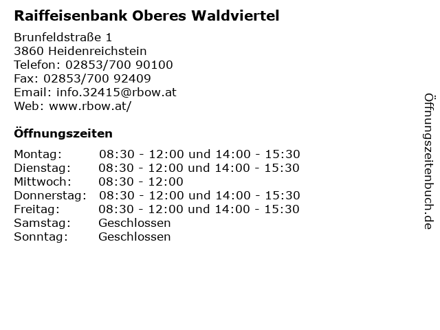 5 Raiffeisenbank Oberes Waldviertel - (Bankomat Bankstelle) (Entfernung: 0,00 km) Brunfeldstraße 1, 3860 Heidenreichstein 6 Raiffeisenbank Oberes Waldviertel - Bankstelle Amaliendorf (Entfernung: 4,65 km) Hauptstraße 376, 3872 Amaliendorf |