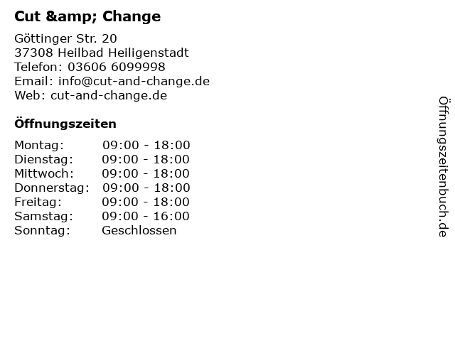 | Öffnungszeiten Cut & Change in Heilbad Heiligenstadt anzeigen | |