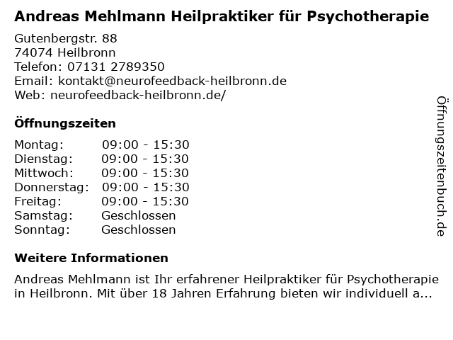 1 Heilpraxis für Psychotherapie Andreas Mehlmann - Heilpraktiker Psychotherapie | Paarberatung | Paartherapie (Entfernung: 0,01 km) Gutenbergstraße 88, 74074 Heilbronn 6 |