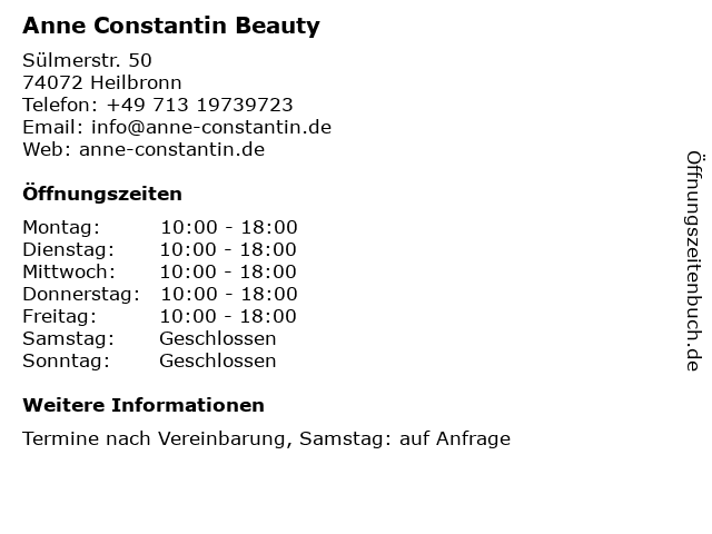 | Öffnungszeiten Anne Constantin Beauty in Heilbronn anzeigen | |