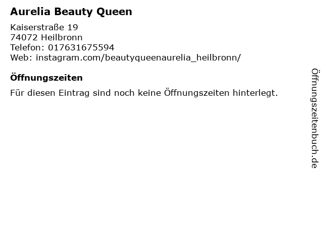 | Öffnungszeiten Aurelia Beauty Queen in Heilbronn anzeigen | |