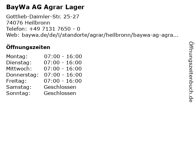 | Öffnungszeiten BayWa AG Agrar Lager in Heilbronn anzeigen | |