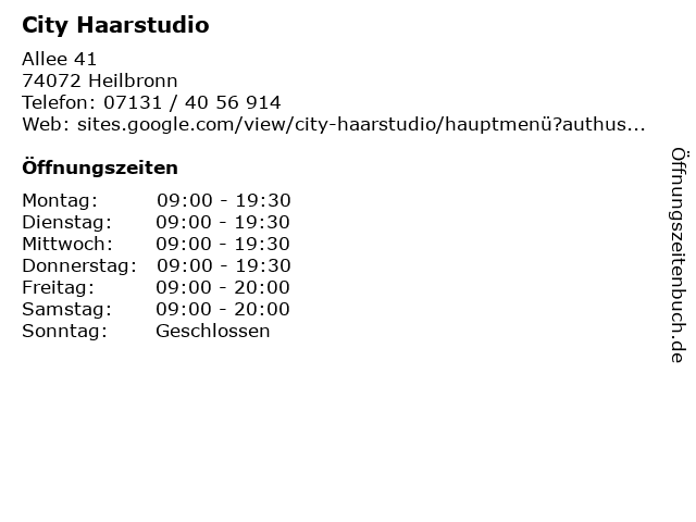 | Öffnungszeiten City Haarstudio in Heilbronn anzeigen | |