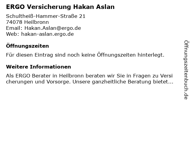 | Öffnungszeiten ERGO Versicherung Hakan Aslan in Heilbronn anzeigen | |