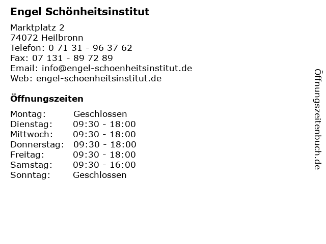 | Öffnungszeiten Engel Schönheitsinstitut in Heilbronn anzeigen | |