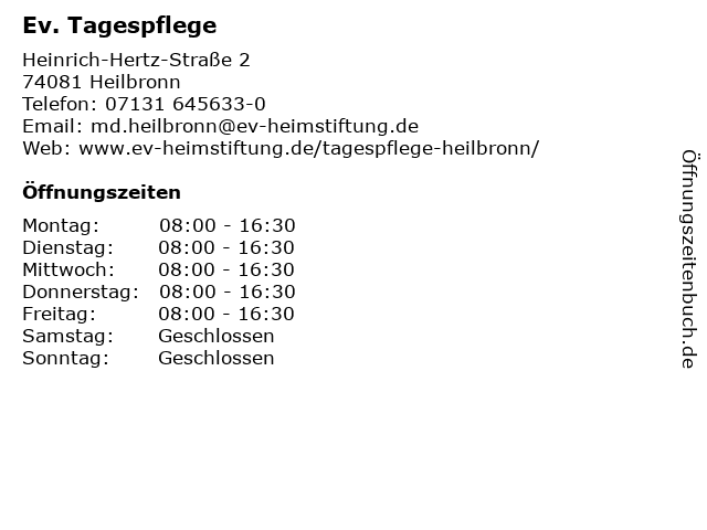 | Öffnungszeiten Ev. Tagespflege in Heilbronn anzeigen | |