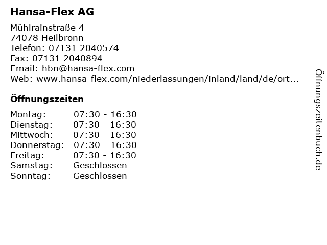 | Öffnungszeiten Hansa-Flex AG in Heilbronn anzeigen | |